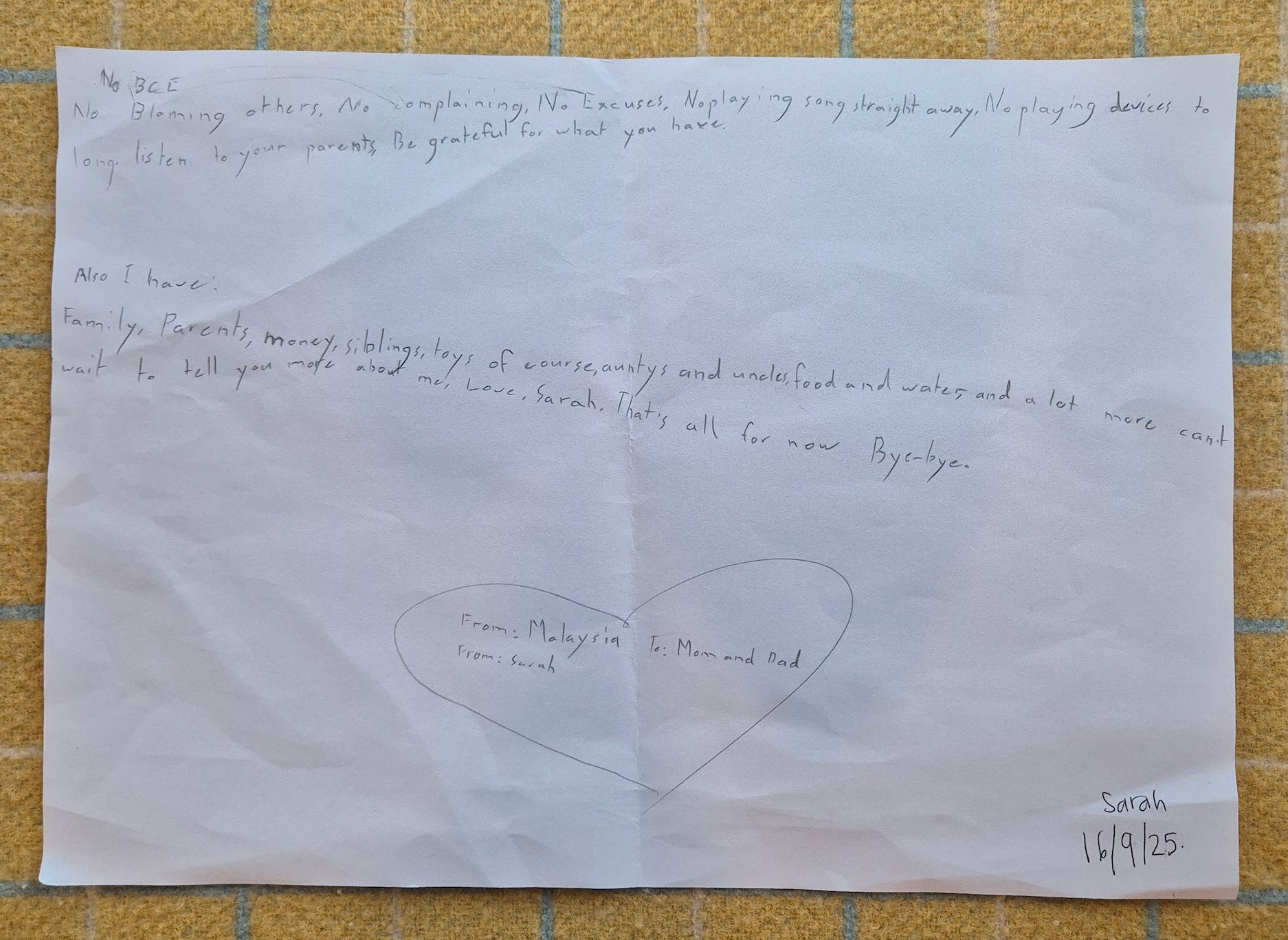 “Also I have: Family, parents, money, siblings, toys of course, aunties and uncles, food and water and a lot more. Can’t wait to tell you more about me. Love, Sarah. That’s all for now. Bye-bye.”