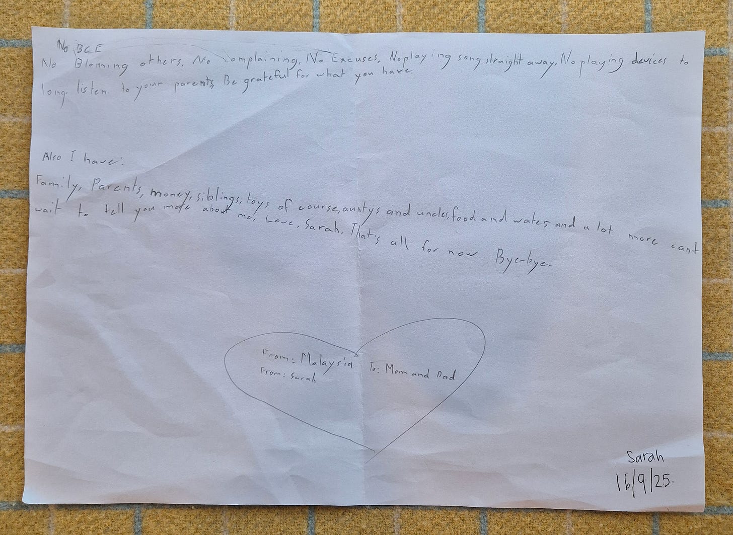 “No blaming others. No complaining. No excuses. No playing songs straight away. No playing devices too long. Listen to your parents. Be grateful for what you have.”
