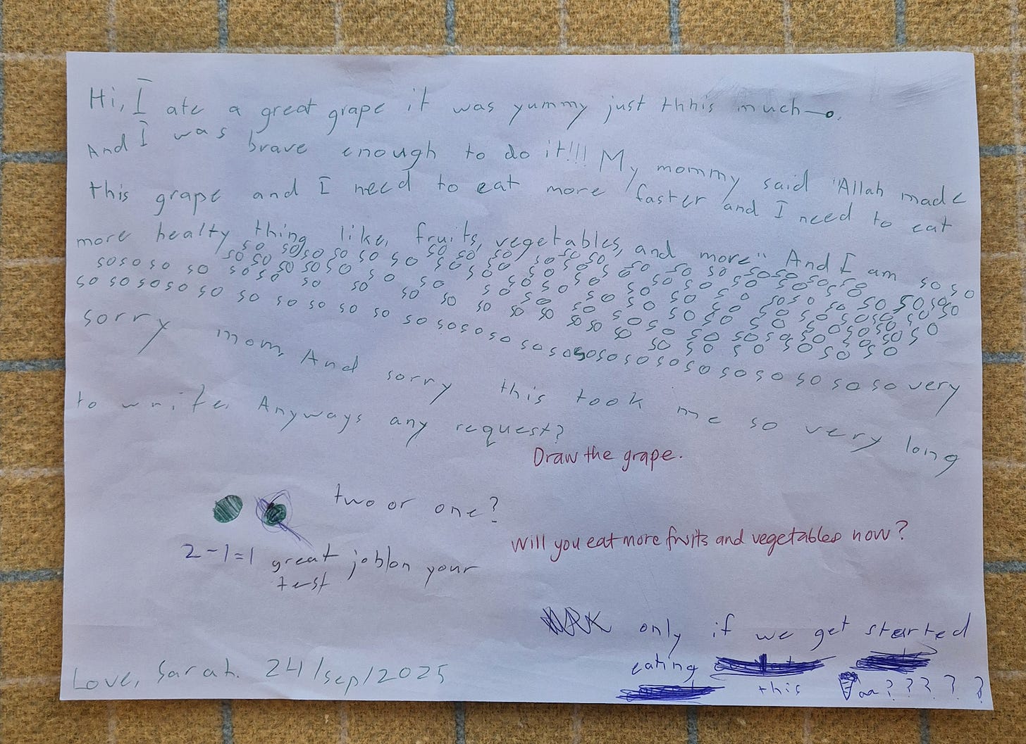 To the point I got so frustrated I put her on time out and she had to stand until she finished her grape. Finally she finished it all, but I was already exhausted and angry. I gave her a lecture about being grateful for food, and then insisted on an apology letter.