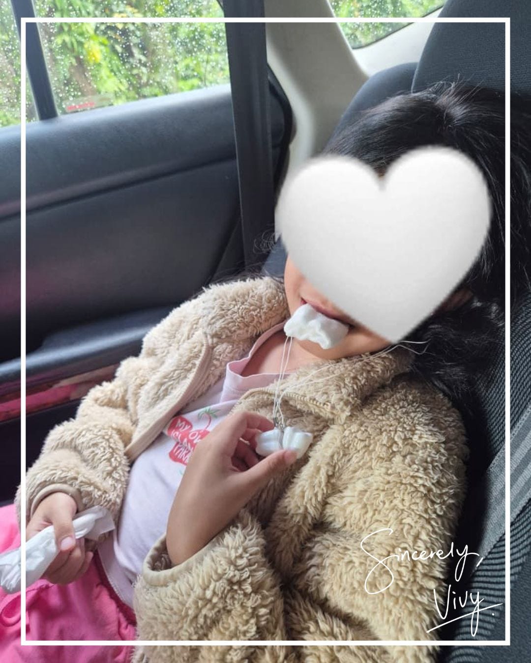 Moral of the story: Sometimes parents have to walk out and leave them because if you’re around, they get even more mengada. Without us, they can actually do it better. The two teeth were pulled out and she didn’t feel a thing. Doctor put them in the tooth necklaces and she wore them so proudly. Then he whipped out a box of toys to let her choose not one, but two toys.