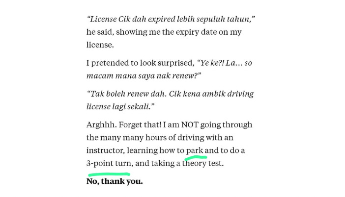 “Ya saya,” I smiled embarrasingly, then proceeded to explain why I’m doing my driving test at this age. (She didn’t ask.)