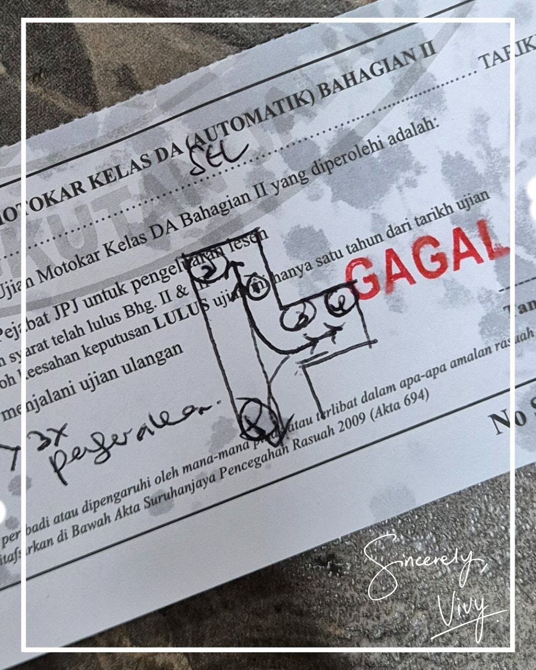“Takde dah, Encik,” I didn’t know whether to laugh or cry. Can’t believe I’m having this convo at a driving test.